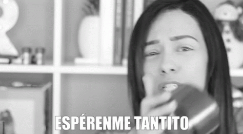 Rosy Mcmichael in a black and white image with the Spanish phrase 'Esperenme Tantito' (Wait for me a little bit).