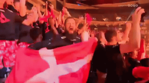 Passionate Danish esports fans cheer loudly, waving a large red and white flag in a vibrant stadium atmosphere.