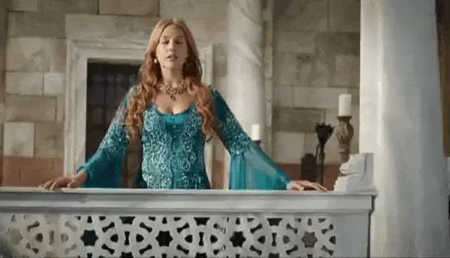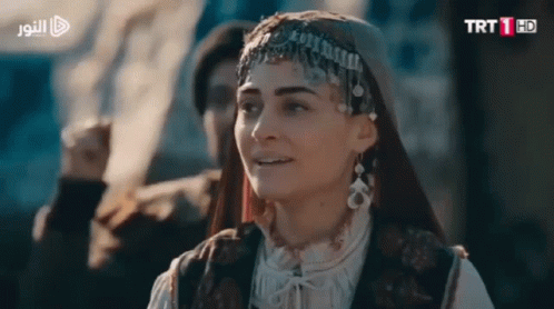 Esra Bilgiç as Halime Hatun, smiling in traditional attire with an ornate headpiece and earrings.