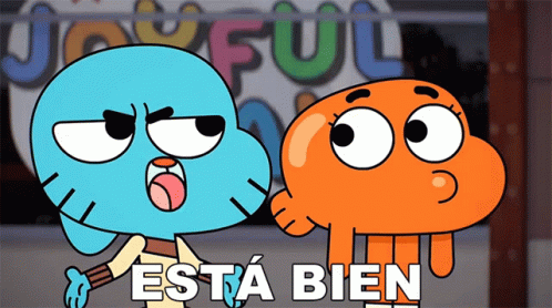 Gumball and Darwin from The Amazing World of Gumball react with the Spanish caption "ESTÁ BIEN" (It's okay).