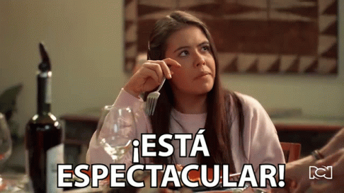 Woman at dinner table exclaims '¡Está Espectacular!' while eating, likely from the show Pa Quererte.
