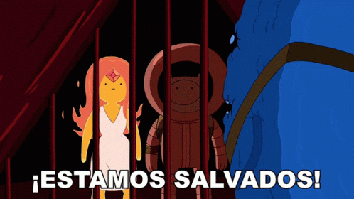 Finn and Flame Princess from Adventure Time are relieved, exclaiming '¡Estamos Salvados!' (We are saved!).
