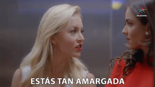 Angelique Boyer and Claudia Martin confront each other, with the Spanish caption 'Estás tan amargada' (You are so bitter) displayed.