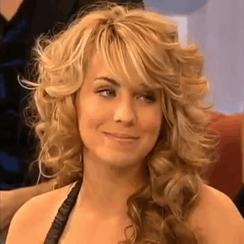 Spanish singer Esther Aranda with blonde curly hair, smiling and looking engagingly off-camera.