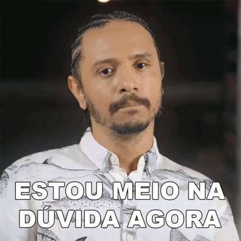João Pimenta from Porta Dos Fundos, wearing a shirt that says 'Estou Meio Na Dúvida Agora', looking thoughtful.