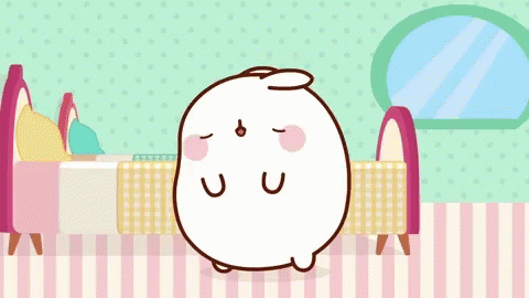 Sleepy Molang yawns, then Piu Piu gently pushes Molang towards the bed for a good night's rest.