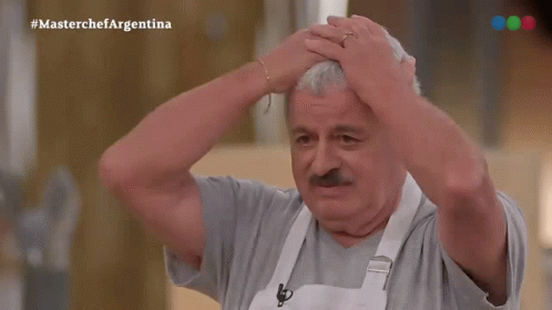 Titi Fernandez looks stressed, holding his head during an episode of Masterchef Argentina.