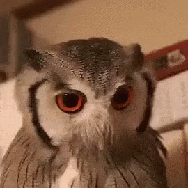 An owl with striking red eyes looks directly at the camera, appearing angry and asking 'Is this funny?' in Russian.