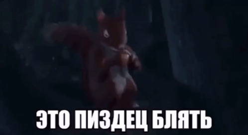 A cartoon squirrel stands in a dark forest with the Russian text 'Это пиздец блять' (This is fucking awful) displayed below.