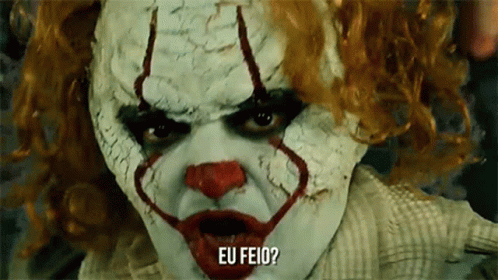 A close-up of an evil clown, resembling Pennywise, asking 'Me ugly?' with a menacing expression.