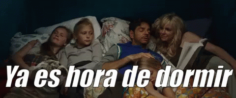 Eugenio Derbez and his family relaxing in bed, with the on-screen caption 'it's time to sleep'.