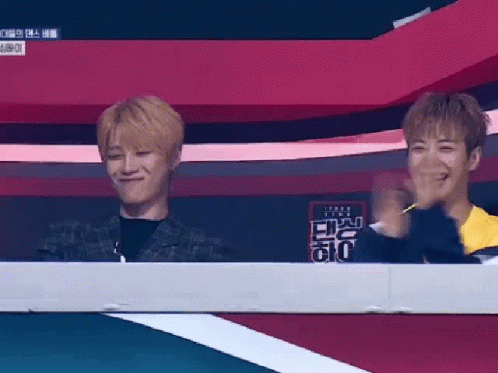 K-pop idols Euijin and Feeldog from UNB smiling and clapping while watching a performance.