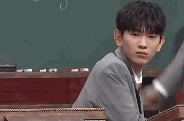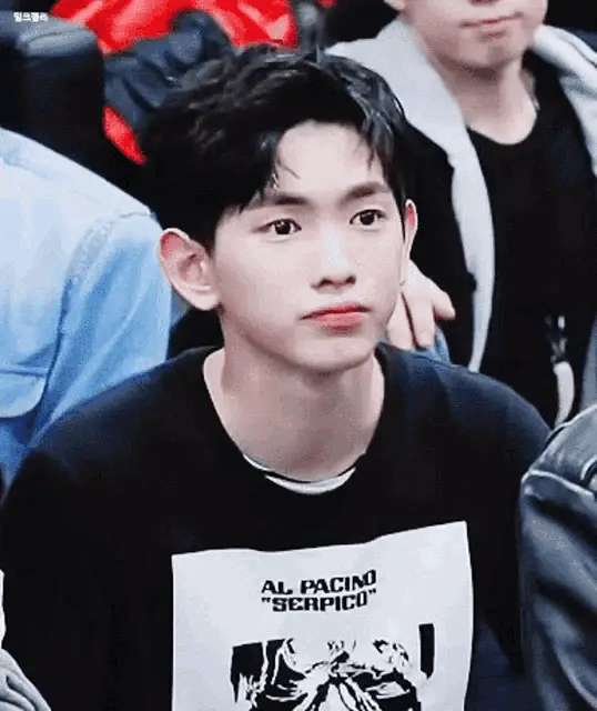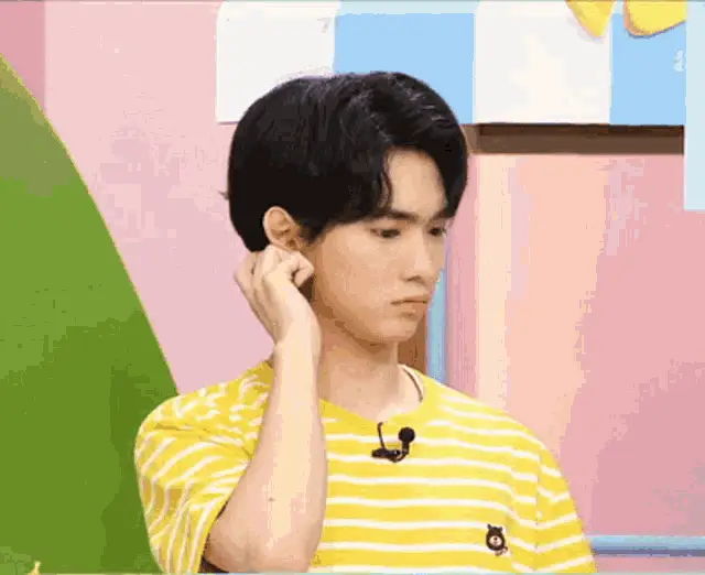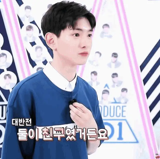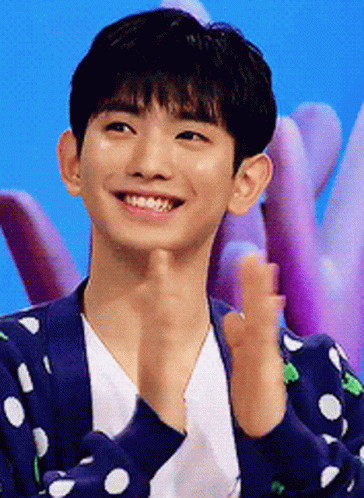 Lee Euiwoong smiles brightly and claps his hands, wearing a blue polka dot jacket.