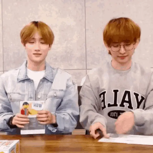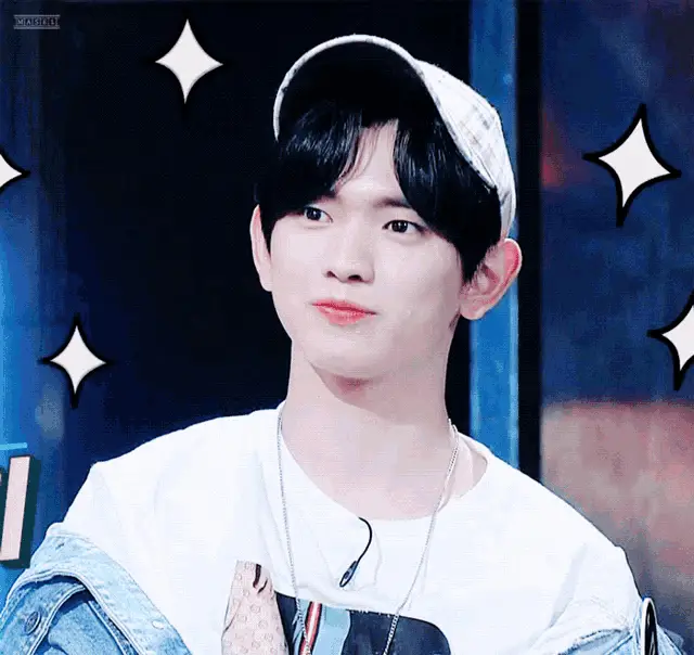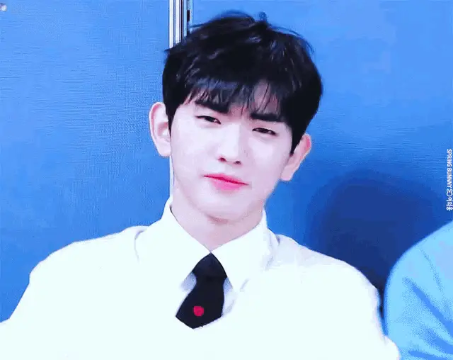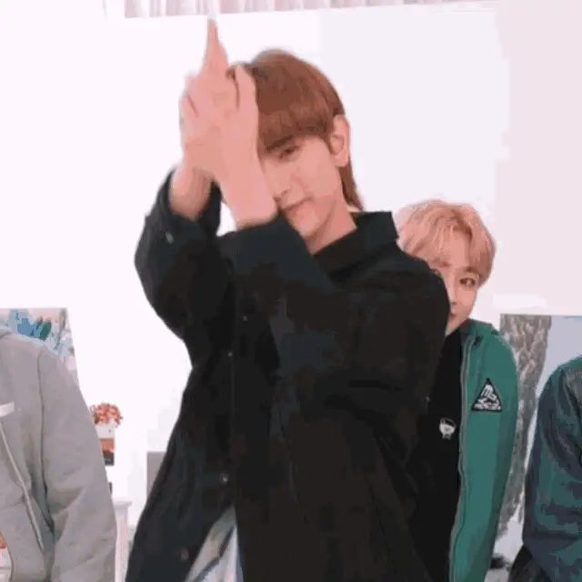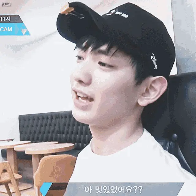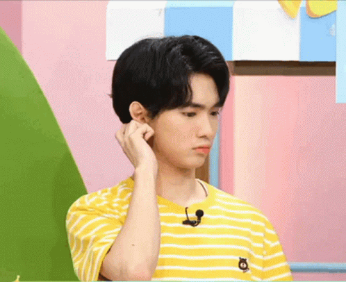 Lee Euiwoong, wearing a yellow and white striped shirt, adjusts his ear and then raises his hand.