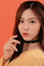 Eunbin from CLC poses playfully for the camera, wearing a yellow top and a heart-studded choker.
