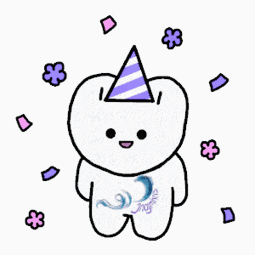 An adorable animated tooth character in a party hat celebrates Khatuna's birthday with flowers and a 'Happy Birthday' message.