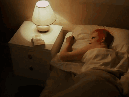 Annie Lennox in bed, turning off a lamp and revealing a card with 'Sweet Dreams are made of this'.