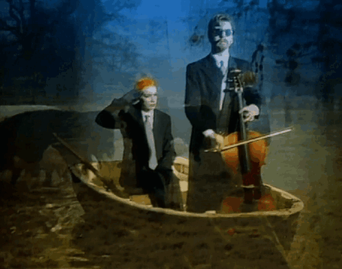 Annie Lennox and a cellist in a boat on dark water, with Annie looking forward in a suit.