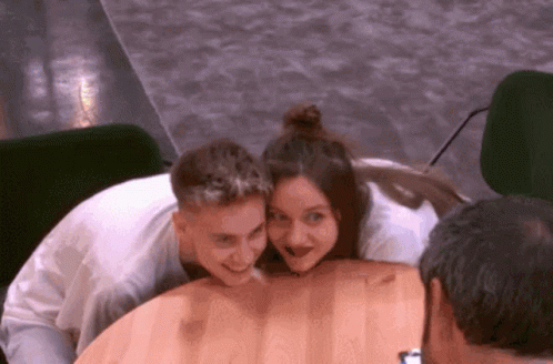 Eva and Hugo from Operación Triunfo smiling and looking intently at something on a table.
