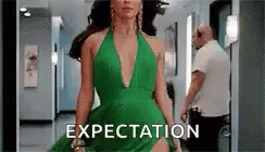 Eva Longoria confidently walks down a hallway in a green dress, embodying 'EXPECTATION' with fabulous sass.