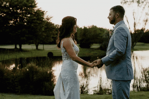 Evan and Leslie Bauer share a romantic dance by a serene lake on their wedding day.