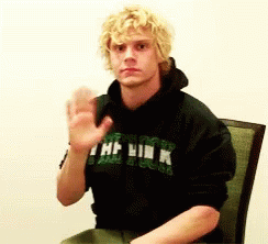 Evan Peters, with curly blonde hair, waves to the camera while wearing a black 'The Hulk' hoodie.