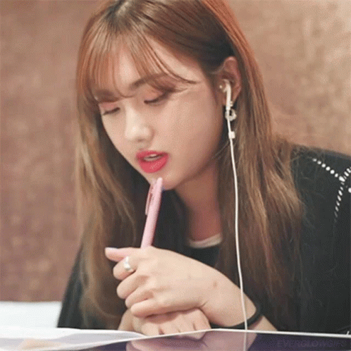 An Everglow member, wearing earphones, holds a pink pen thoughtfully, showcasing a moment of concentration.