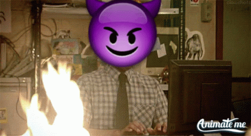 Man with purple devil emoji face sits at a desk with fire, embodying the 'This is Fine' meme.