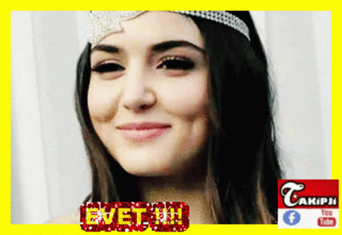 Hande Erçel smiles and laughs, wearing a headband, with 'EVET' text displayed.