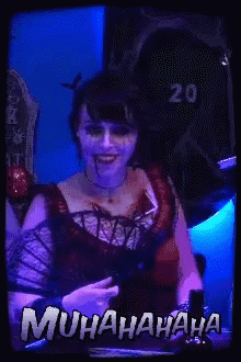 Meghan Caves delivers a theatrical evil laugh, exclaiming 'MUHAHAHAHA' in a Halloween-themed setting.