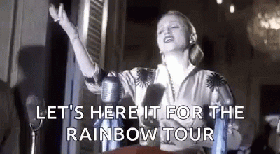 Madonna as Eva Peron performs during the Rainbow Tour, singing into a microphone.