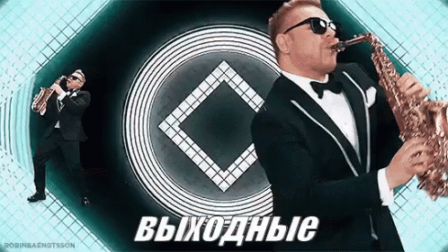 A man in a tuxedo plays a saxophone in a vibrant, geometric setting, featuring the Russian word 'WEEKEND' (Выходные) and referencing Eurovision 2017 Moldova.