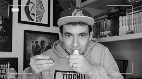 Gabriel Dearo reacts with disgust, making a face after smelling something unpleasant from a bottle.