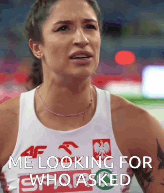 Ewa Swoboda, a Polish athlete, looking around with a confused expression, embodying the popular 'who asked' meme.