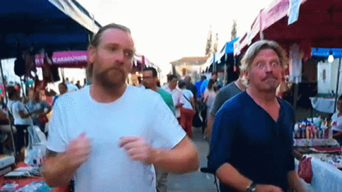 Ewan McGregor and Charley Boorman walk through a bustling outdoor market, likely during their Long Way Up journey.