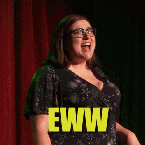 Kt Behrens delivers a hilarious 'Eww' reaction on stage, standing in front of a red curtain.