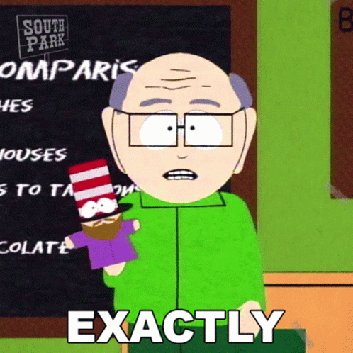 Mr. Garrison from South Park holds a puppet and emphasizes a point by saying 'Exactly'.
