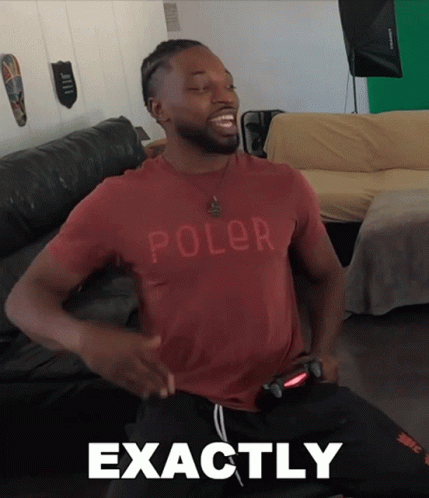 Preacher Lawson, wearing a red "POLER" shirt, reacts with an emphatic "Exactly!" while holding a game controller.