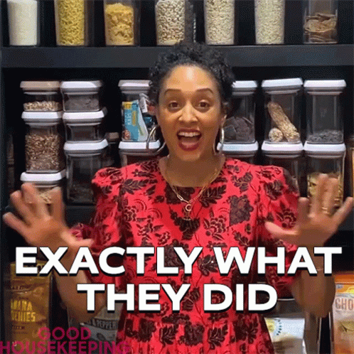 Tia Mowry stands in front of a well-organized pantry, emphasizing 'Exactly What They Did' in a home organization context.
