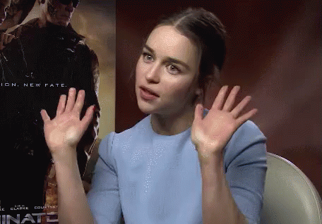 A woman enthusiastically raising her hands and smiling, expressing excitement in front of a movie poster.