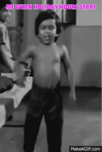 A shirtless little boy dances energetically, expressing excitement for holiday hours in a classic black and white clip.