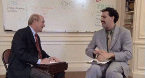 Two men high-five and laugh excitedly, one in a suit, in front of a whiteboard.