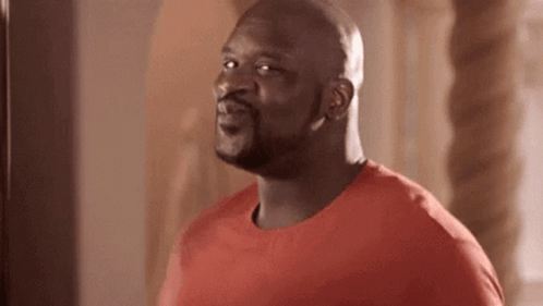 Shaquille O'Neal's excited dance, shimmying happily in a red shirt.