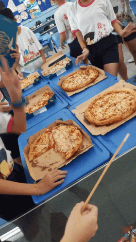A group of people, likely kids or teens, gather around tables to enjoy a delicious pizza party.