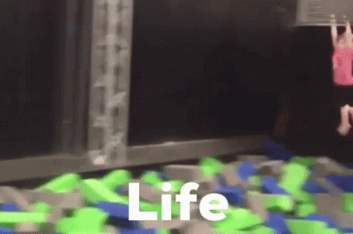 A person jumps into a foam pit with green and blue blocks, as the word 'Life' appears on screen.