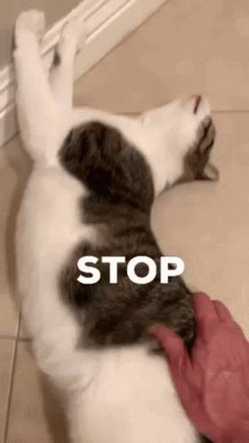 Excusemeety Happysunnylight, a playful cat, enjoys belly rubs with a 'STOP' overlay on the video.
