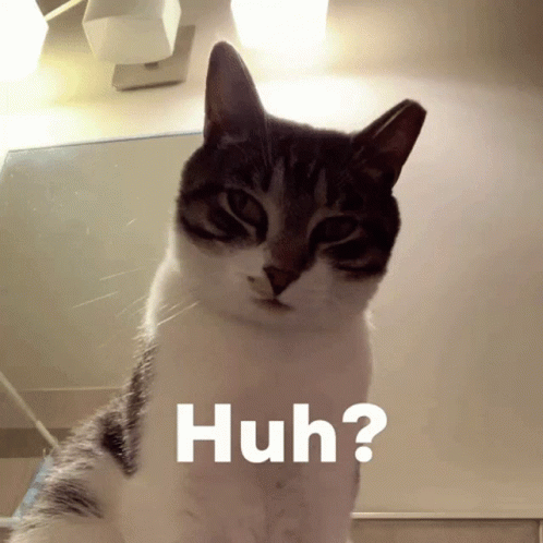 Excusemeety Happysunnylight, a cat, looks confused with 'Huh?' caption.