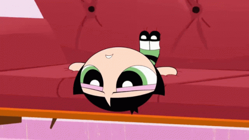Bellota (Buttercup) from The Powerpuff Girls is utterly exhausted, lying upside down on a red couch.