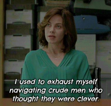 Michelle Monaghan as Maggie Hart in True Detective, expressing exhaustion from dealing with crude, overconfident men.