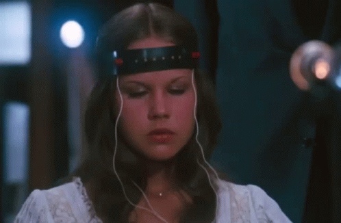 Linda Blair as Regan MacNeil in Exorcist 2, wearing a headband and appearing hypnotized.